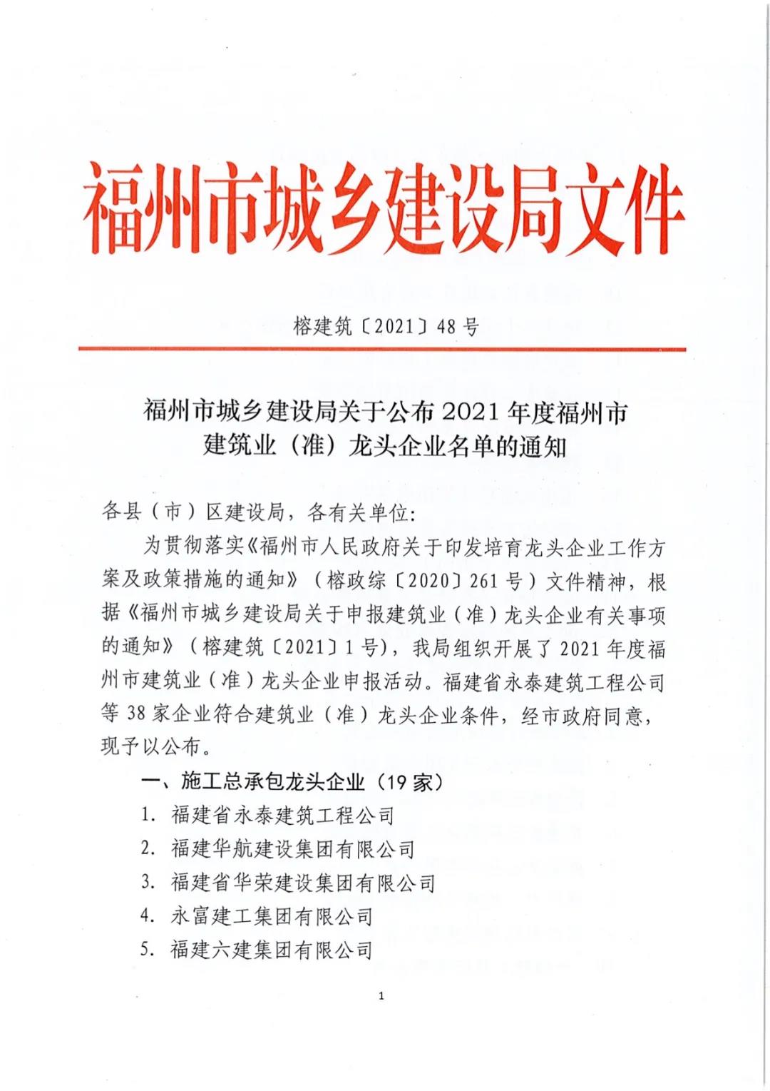 按照省委、市委“扶引大龙头、培育大集群、发展大产业”的工作部署,为培育建筑业龙头企业,促进建筑业经济高质量发展,特制定培育建筑业龙头企业工作方案及政策措施。并于年初,启动了申报工作。沙龙国际sa36亚洲第一品牌建设集团经过层层筛选、推荐、公示、审批等环节,荣获2021年度福州建筑业准龙头企业称号。